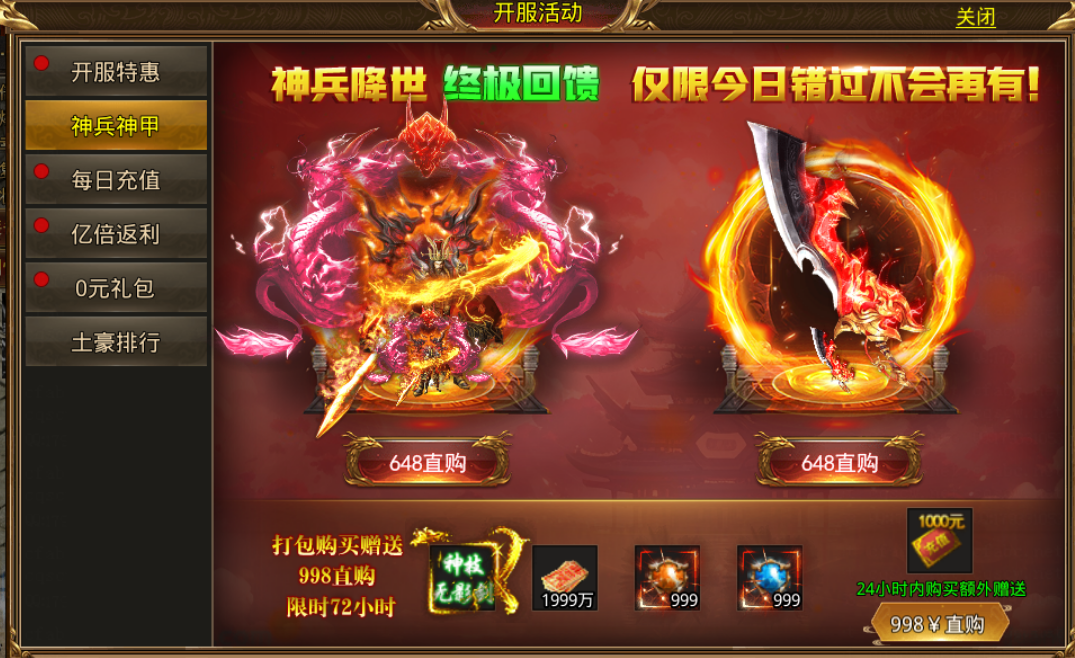 1、【新增】神兵神甲,新区第一天开放,需要用户在本区累充大于288后显示